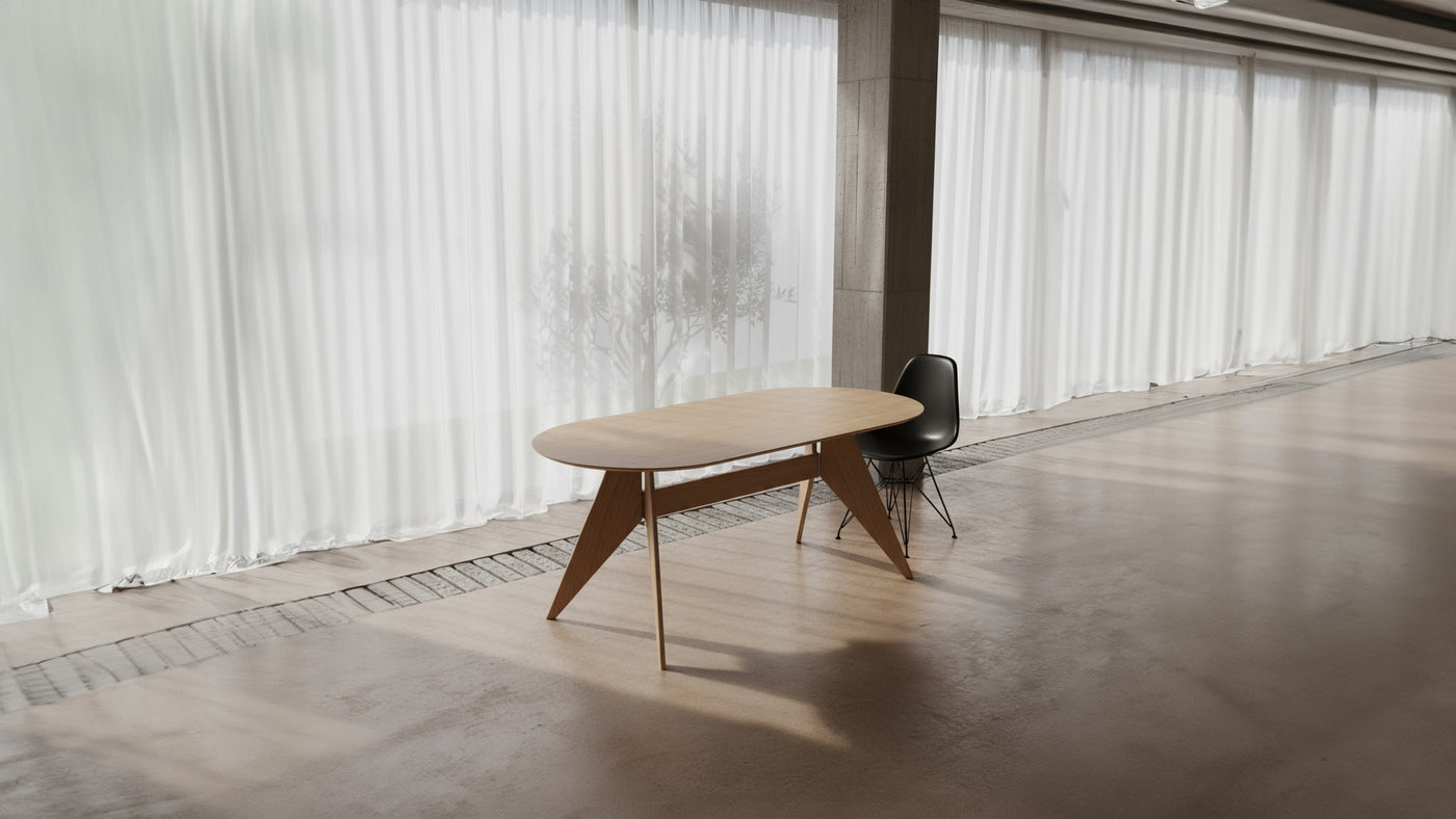 Das fein gemasertes Eichenholz hat eine herzliche und klare Ausstrahlung auf den Raum. Der Tisch wird zum Ruhepol und läd direkt ein sich an ihn zu setzen und mit der Hand über die Tischfläche zu streichen. Fühle die Weite der Nordischen Wälder, die erfüllt sind vom Duft, harziger Bäume und feuchten Moos.